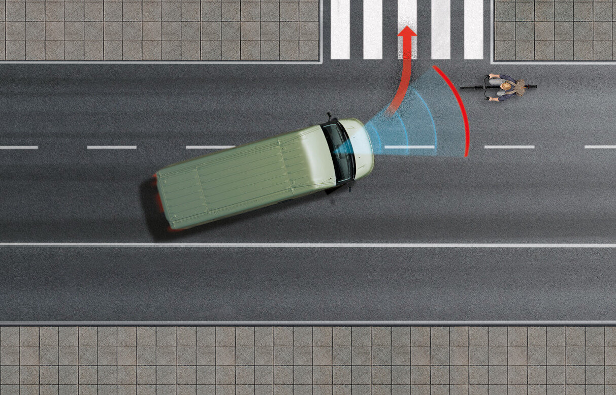 Diese Funktion ermöglicht ein sicheres Abbiegen, indem sie potenzielle Kollisionen mit Fahrzeugen oder gefährdeten Verkehrsteilnehmern verhindert und im Ernstfall automatisch einen Bremsvorgang einleitet.