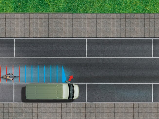 Das System reagiert auf zugelassene Fahrzeuge und gefährdete Verkehrsteilnehmer. Es verhindert Kollisionen mit langsamen Fußgängern und Radfahrern.