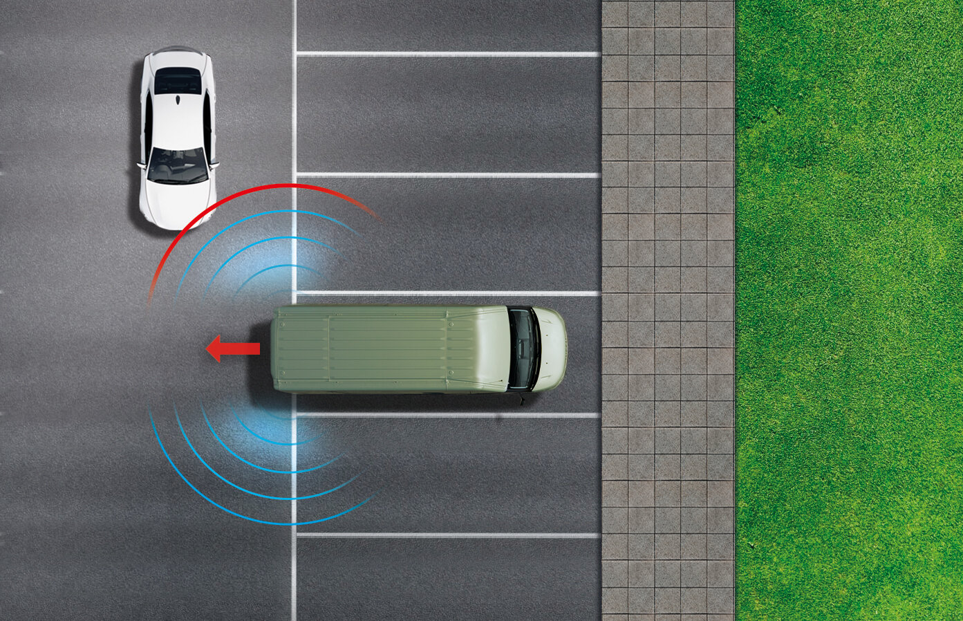 Diese Funktion ermöglicht ein einfaches und sicheres Zurücksetzen des Fahrzeugs. Sie erhalten Informationen zu Fahrzeugen und Hindernissen in der Umgebung und es ertönt ein Warnsignal, wenn Sie zu dicht heranfahren. Bei Bedarf wird ein automatischer Bremsvorgang eingeleitet, um eine Kollision zu vermeiden.