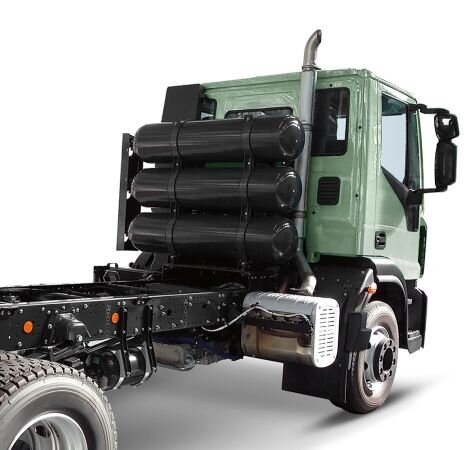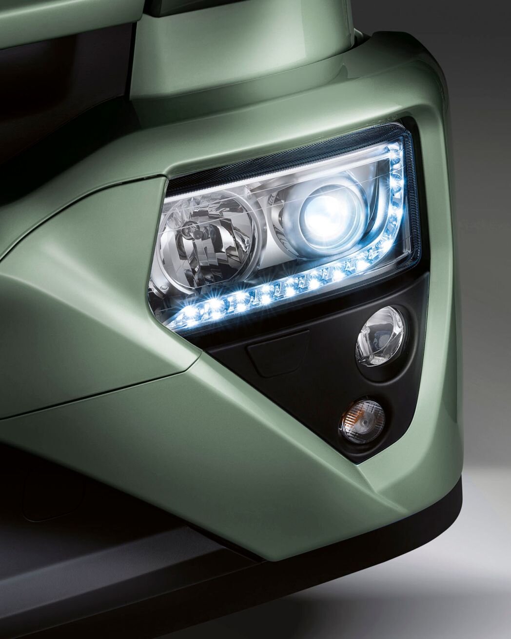 Im Stoßfänger sind die Trittstufen für den Aufstieg zur Kabine und der Radarsensor des fortschrittlichen Fahrerassistenzsystems und des Notbremsassistenten AEBS (Advanced Emergency Braking System) integriert. Die Scheinwerfer sind serienmäßig mit LED-Tagfahrlicht (DRL) ausgestattet.